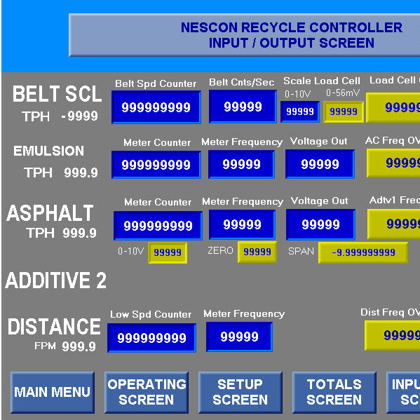 - Allows for entry of time interval that production values are to be recorded. At each time interval (ie. every 10 minutes), the values for Date, Time, Distance processed (or Station no.), RAP tons, Asphalt tons, and Additive tons are stored in memory.